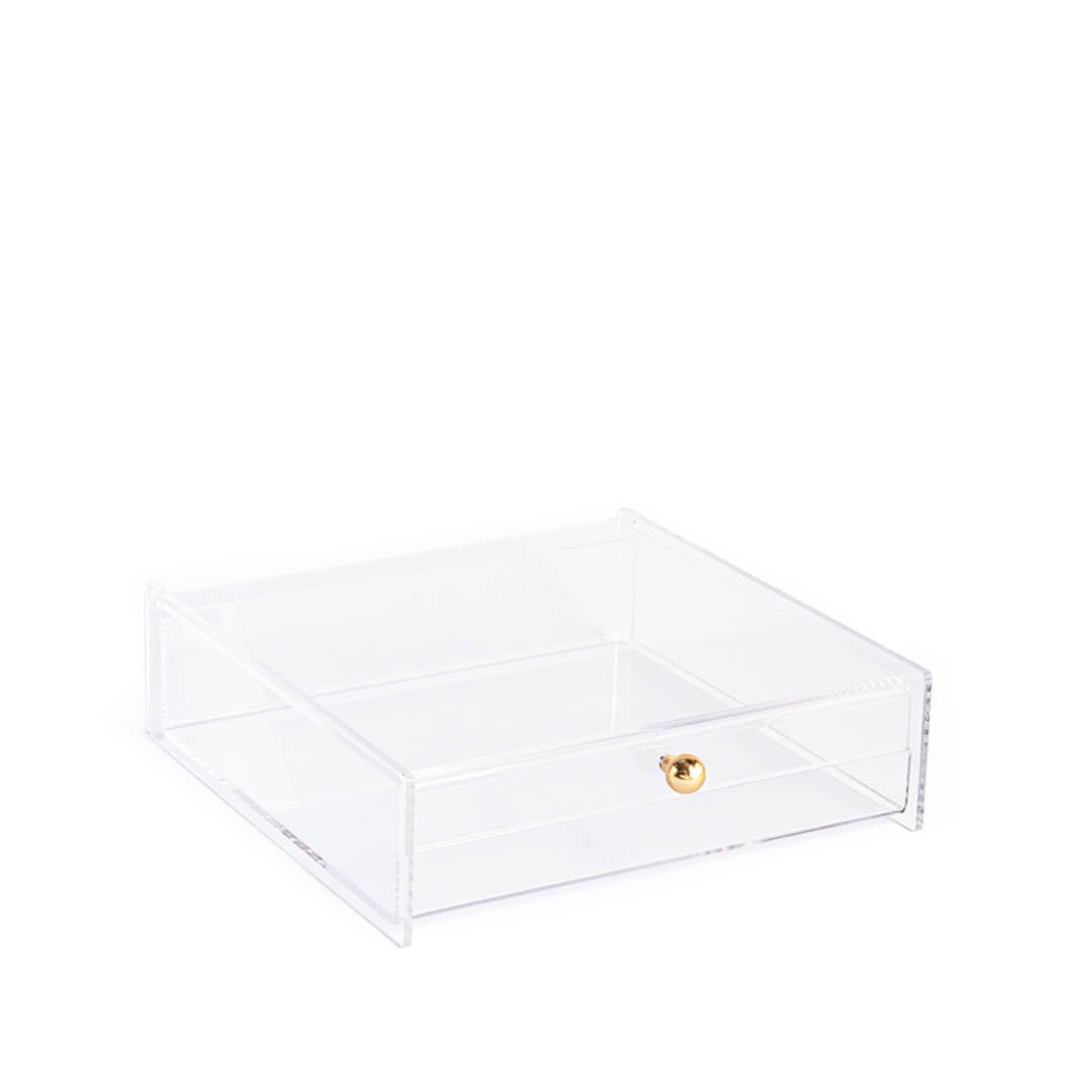 Elevate your organization with this premium acrylic drawer organizer, featuring a crystal-clear design and a luxurious gold knob for a touch of elegance. Perfect for storing cosmetics, jewelry, stationery, or office supplies, its transparent construction allows you to easily find and showcase your essentials while keeping your space tidy. Measuring 10 x 6 x 3 inches, it fits seamlessly into most drawers or can be beautifully displayed on a vanity or desk. The durable, easy-to-clean acrylic adds sophistication to any room, making it a stylish and functional addition to your home or office.